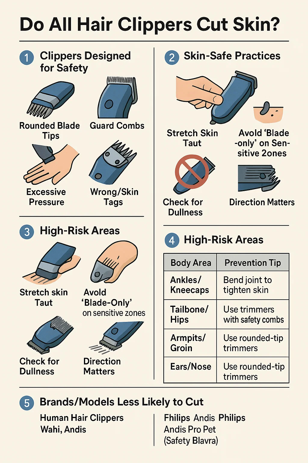 از "Blade-Avoid "Blade-Only" در مناطق حساس اجتناب کنید: فقط" در مناطق حساس**: هرگز از گیره های بدون محافظ در نزدیکی نواحی با پوست نازک (صورت، اندام تناسلی، معده) استفاده نکنید.