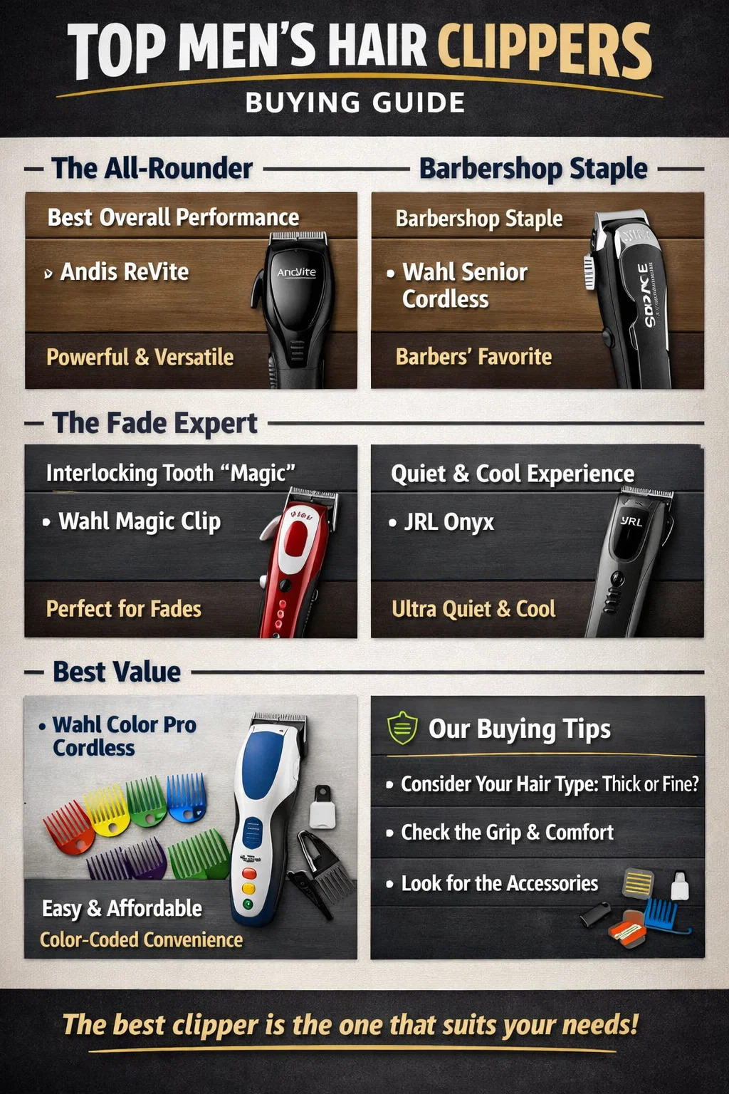 Clipper با کد رنگی (به عنوان مثال، Wahl Color Pro Cordless): بزرگترین نقطه فروش آن "طول های با کد رنگ" است. می توانید اعداد طول را کاملاً نادیده بگیرید و فقط رنگ مناسب خود را به خاطر بسپارید. اگرچه موتوری به اندازه مدل های حرفه ای ندارد، اما برای مصارف خانگی معمولی کافی است و قیمت آن بسیار مقرون به صرفه است.
